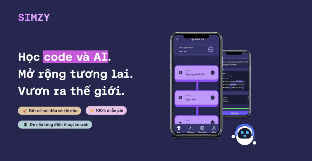 Simzy là ứng dụng học lập trình phổ biến. Miễn phí 100%, vui nhộn và đa dạng bài học cùng với dự án thực tế.